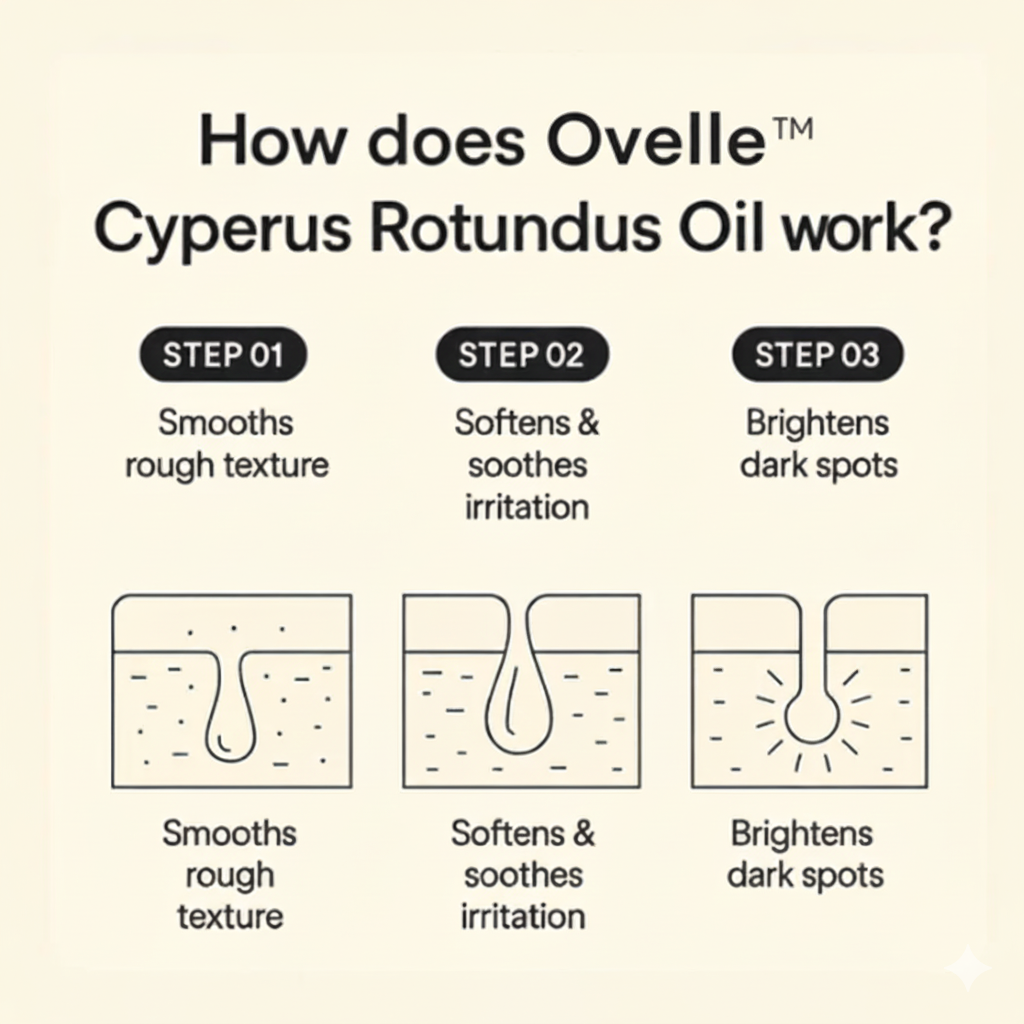 Ovelle™ Cyperus Rotundus Oil delivers real, visible results slowing regrowth, smoothing texture, and brightening skin tone.
